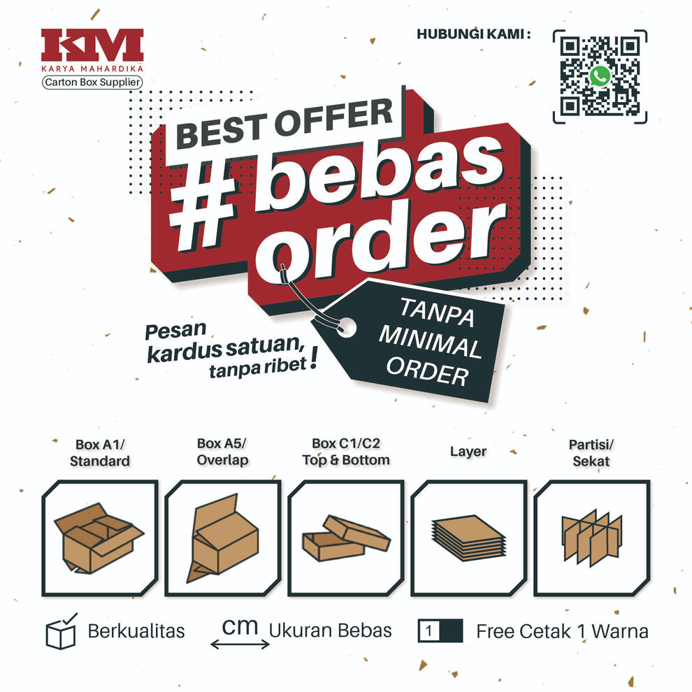Hanya di Karya Mahardika, kami dengan bangga menghadirkan layanan Carton Box #BebasOrder, tanpa batasan minimal pembelian. Kami mengundang Anda untuk merasakan keleluasaan sepenuhnya dalam merancang kemasan yang memenuhi standar tinggi dan kebutuhan khusus bisnis Anda. Dengan komitmen pada kualitas terbaik, Karya Mahardika adalah mitra terpercaya untuk menghadirkan solusi kemasan yang unik dan eksklusif. Sempurnakan pengalaman bisnis Anda dengan Carton Box sesuai keinginan, karena bagi kami, setiap pesanan adalah sebagai karya istimewa yang kami layani dengan dedikasi dan keahlian kami.